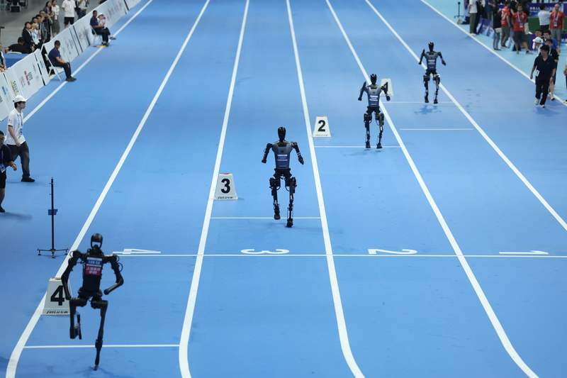 尽管今年4月,大家已经见识了机器人跑“半马”的风采,但在此次运动会上,机器人在田径场参加竞技赛比拼仍是一大看点。鸣枪后,全尺寸人形机器人往往大步流星、一马当先,有的机器人跌跌撞撞,有的机器人尺寸较小,双脚紧倒,也只能快走,跑不起来,让人忍俊不禁。记者注意到,无论是1500米还是400米比赛,都有不少队伍选择使用宇树机器人。