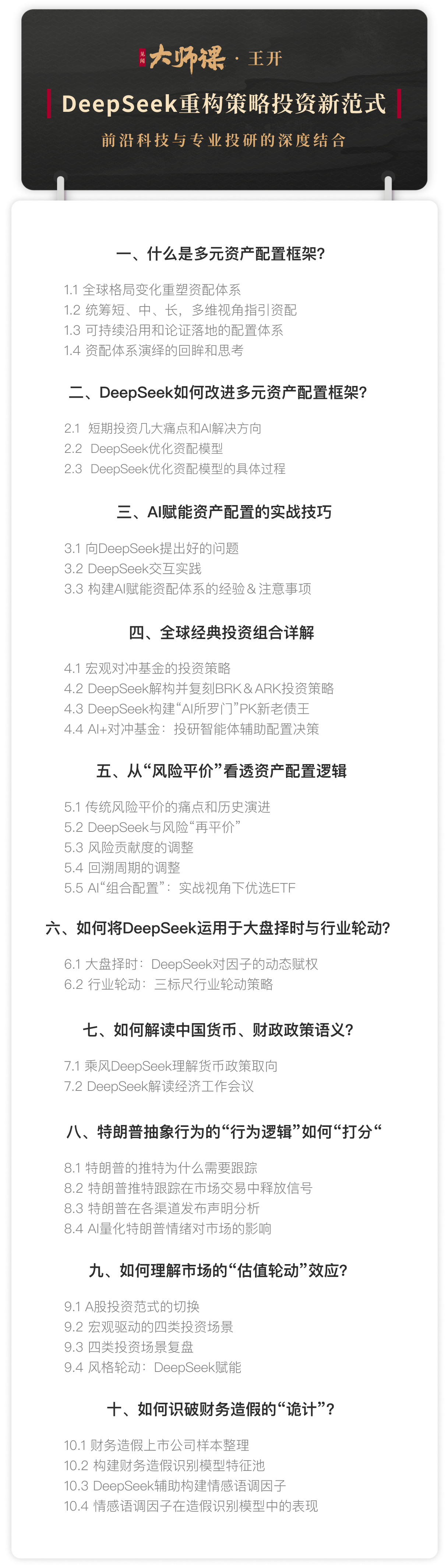 现在,是时候升级你的投资思维了。本期课程,王开老师将为你揭示,如何用DeepSeek重塑策略投资新范式,摆脱“单体依赖”,告别“主观情绪”的干扰,真正实现精准有效的资产配置。